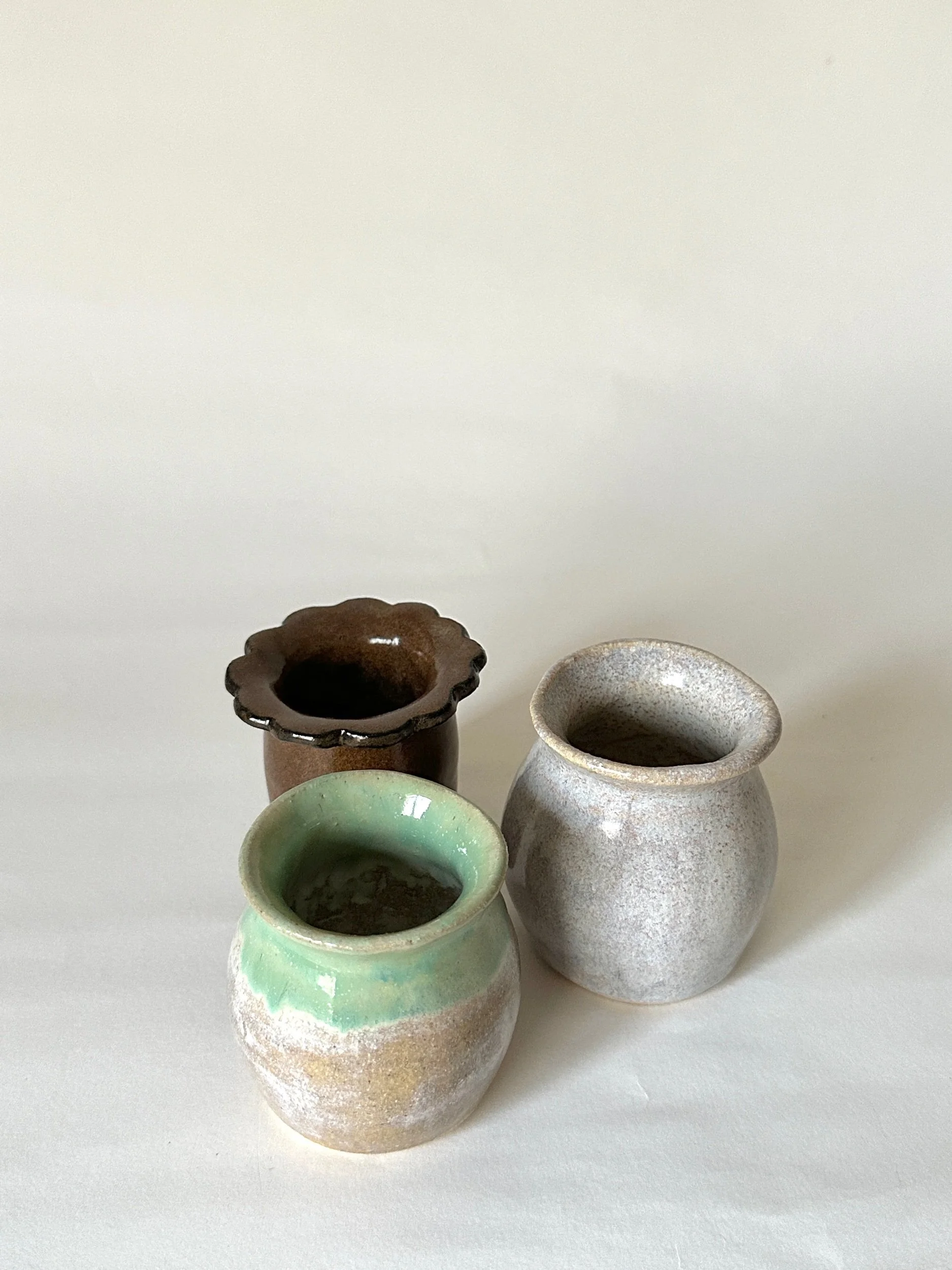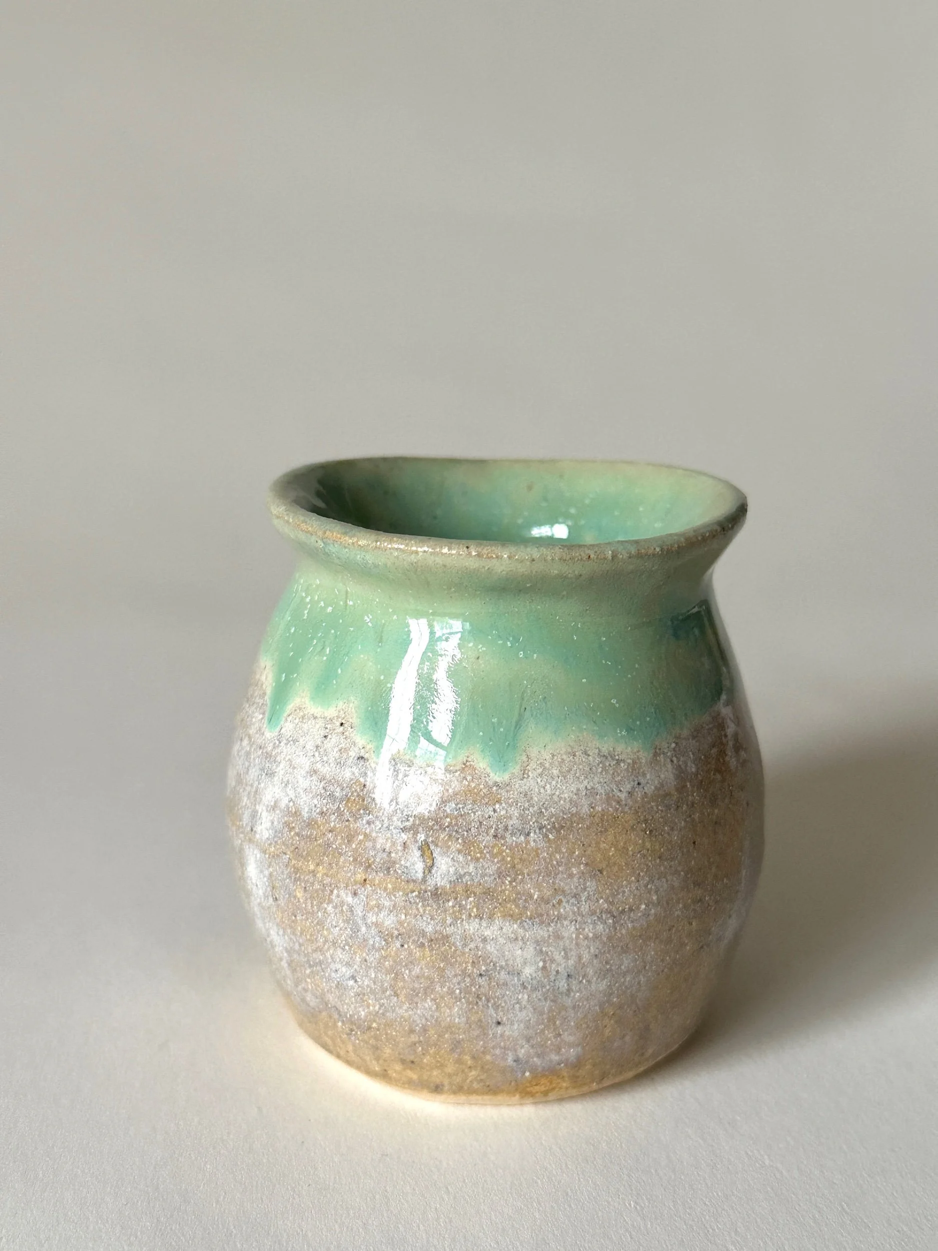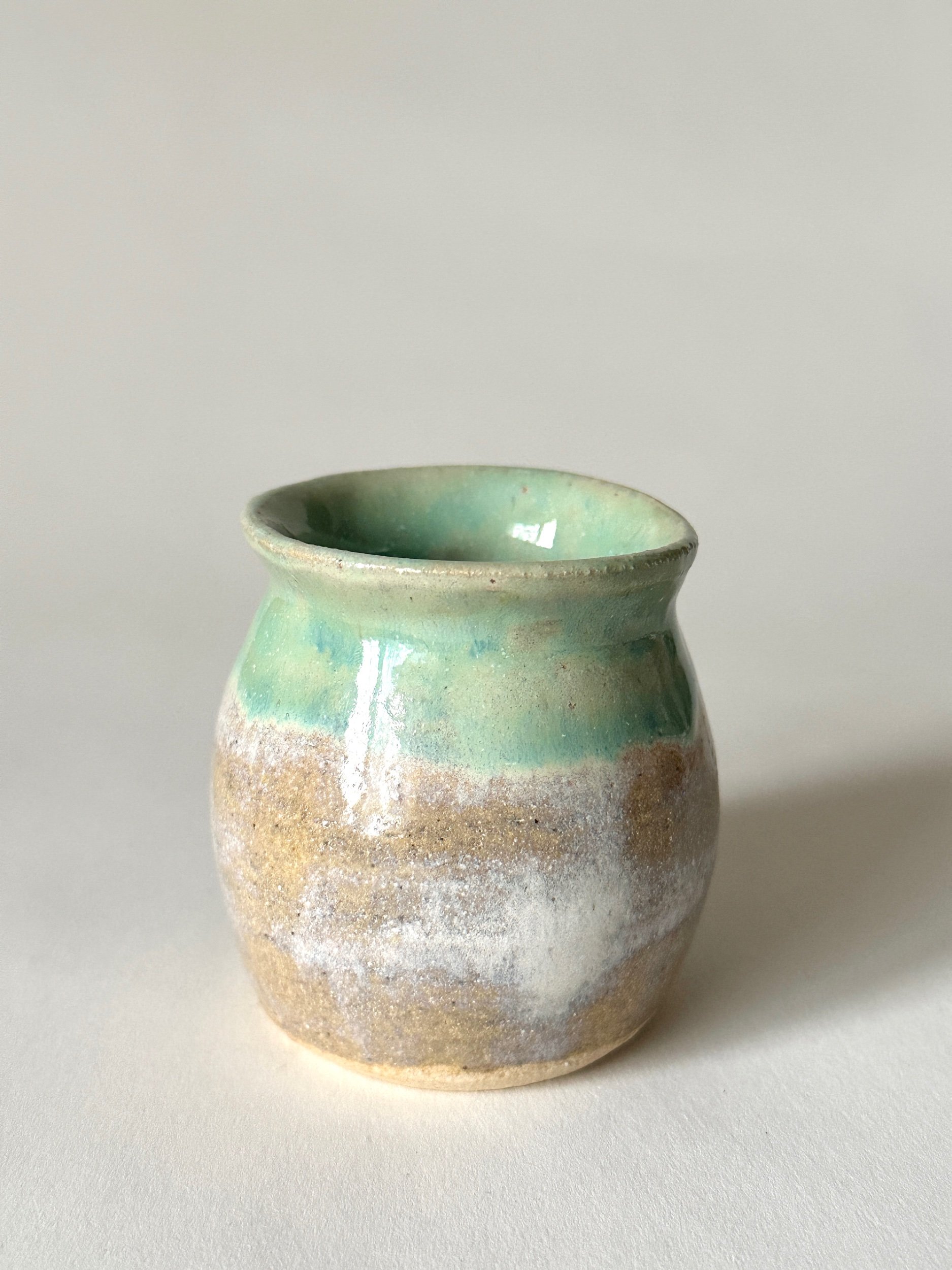 Small hand built bud vase, hand painted in a pale green that melts into a soft white, inspired by the ocean waves