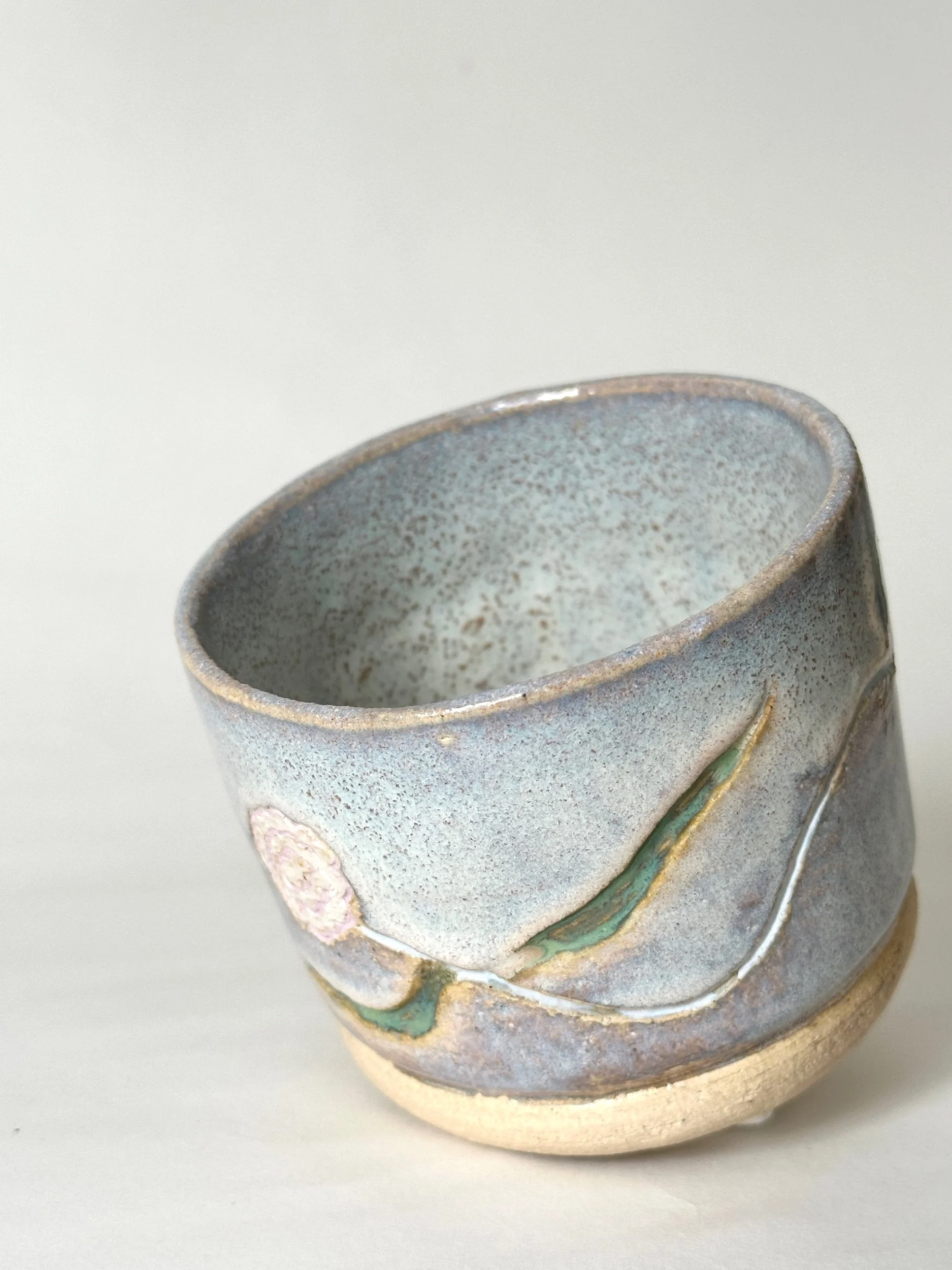 shop › flower cup Image 1 of 4 Image 2 of 4 Image 3 of 4 Image 4 of 4 flower cup £25.00 sold out Hand built cup with carved flower motif, painted by hand in an ethereal misty glaze W x 9.5cm H x 7cm Sold Out Added! Hand built cup with carved flower motif, painted by hand in an ethereal misty glaze W x 9.5cm H x 7cm
